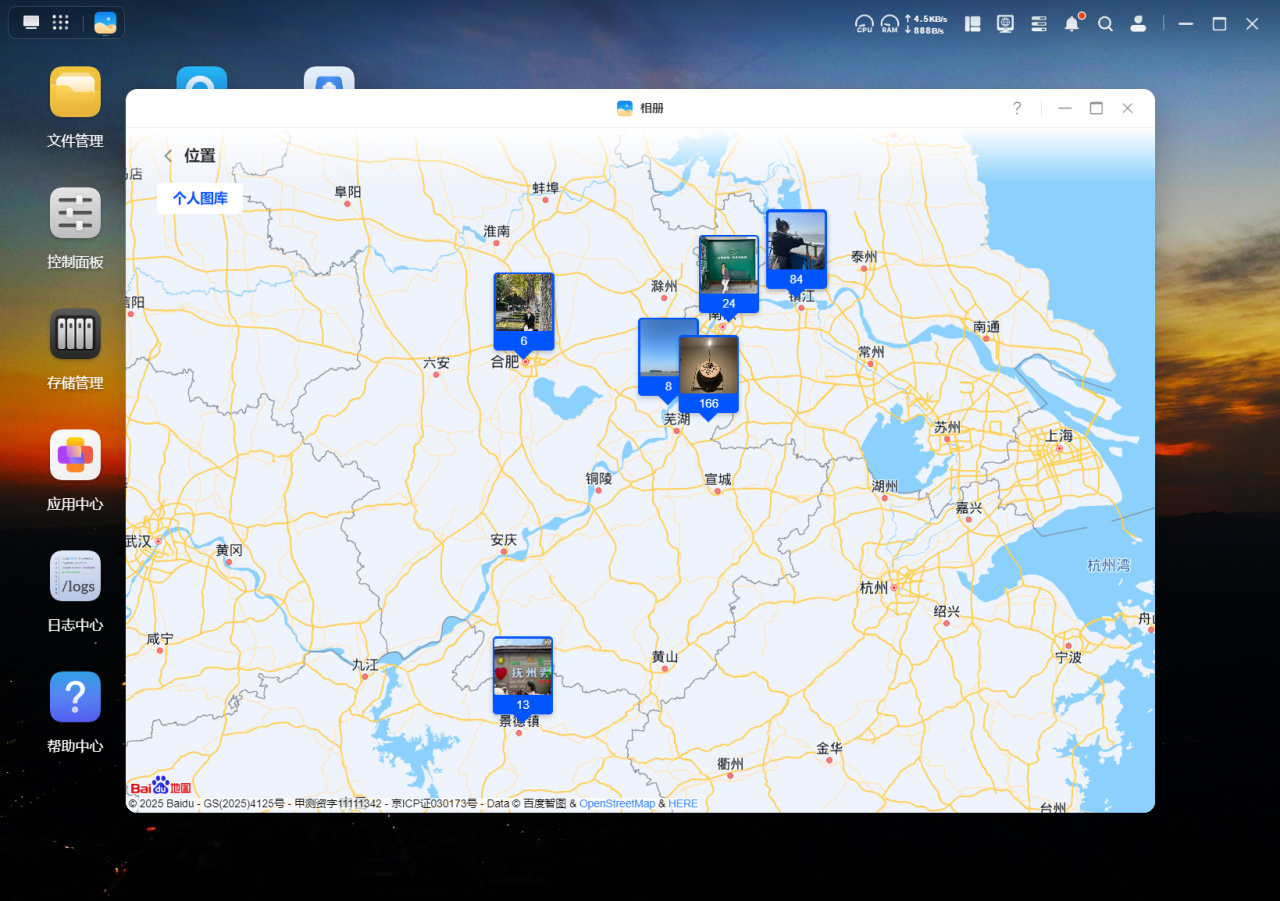 相册支持显示照片地理位置,喜欢旅游的玩家可以把手机拍摄的照片存入NAS里,然后相册会识别整理同一个地方的照片在地图上显示,对于回忆特别有仪式感。