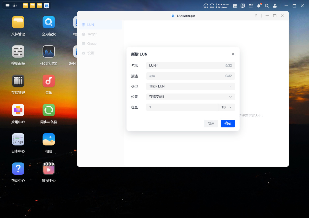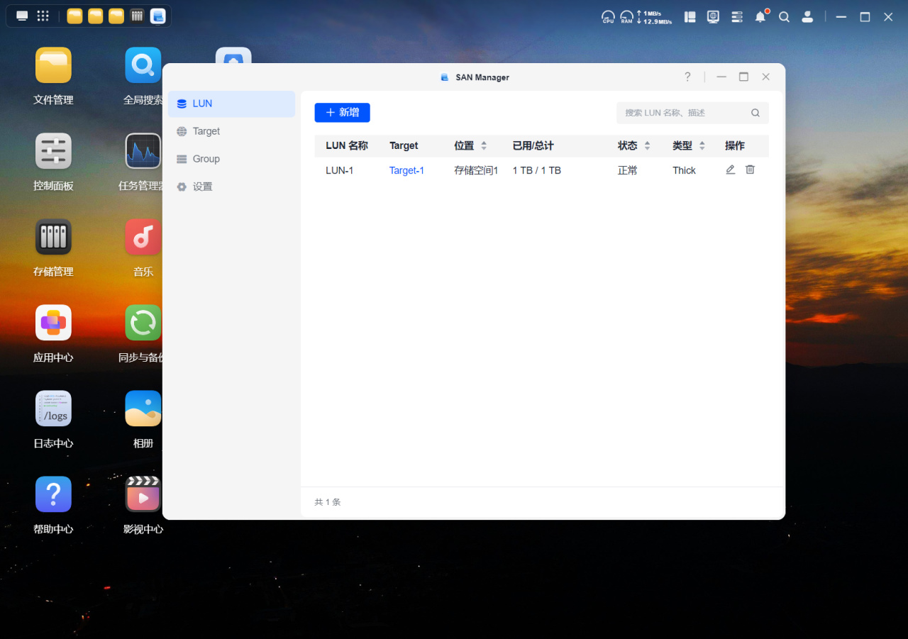 下载完点进去在LUN界面新增LUN,选择位置(这里主要看你刚开始设置的存储池是什么类型),容量根据实际大小来,我选择的是1TB。