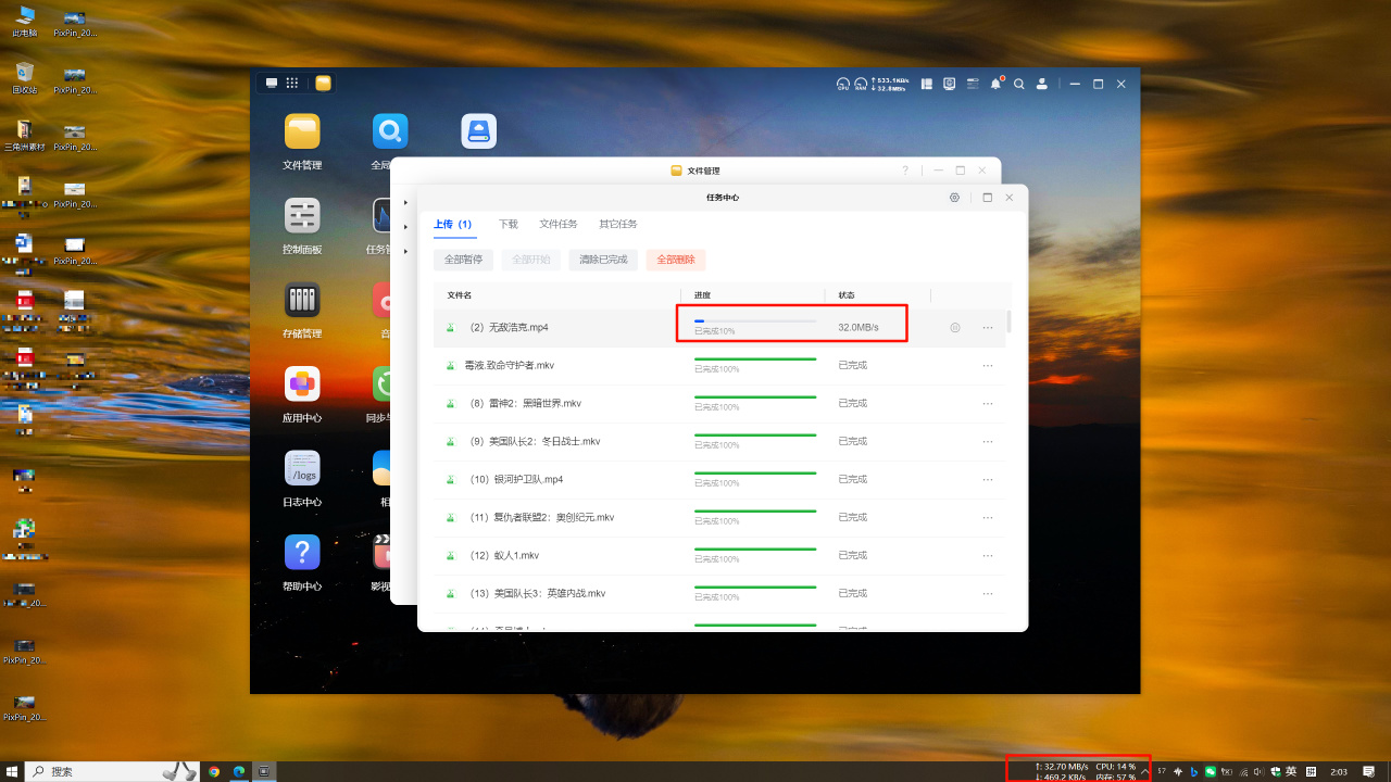 我的影视资源基本都在百度网盘里,NAS里有网盘工具,可以链接目前市面上主流的网盘,支持同步、下载、上传这些主流网盘内的资源,但百度网盘的吃相是真难看,你想让NAS同步百度网盘内的资源你还得花79¥开百度云NAS会员!所以我直接选择下载到本地再上传NAS,本地视频上传到NAS的速度受限于家庭网络的上行速度,基本是顶着家庭网络带宽跑满的,所以理论上不会发生像企业网盘那样限速情况,但会物理受限于家庭网络的带宽。