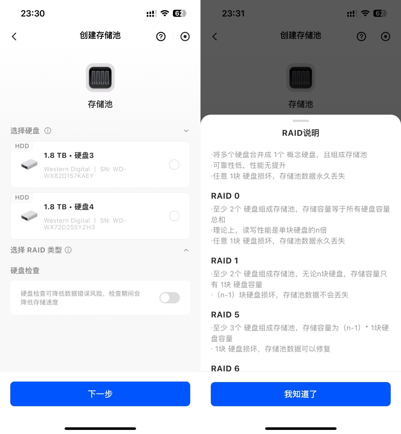 主要功能指引完之后要做的就是创建存储池。存储格式我直接默认EXT4,存储池创建类型这里补充下,想拿NAS玩游戏追求加载速度的玩家们优先选择RAID 0,这样3A游戏的安装速度和加载速度都接近于本地磁盘。