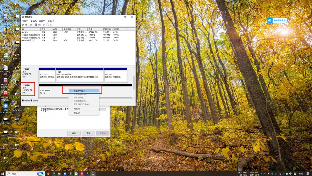 点击确定之后出现未分配的磁盘2,右键选择新建简单卷