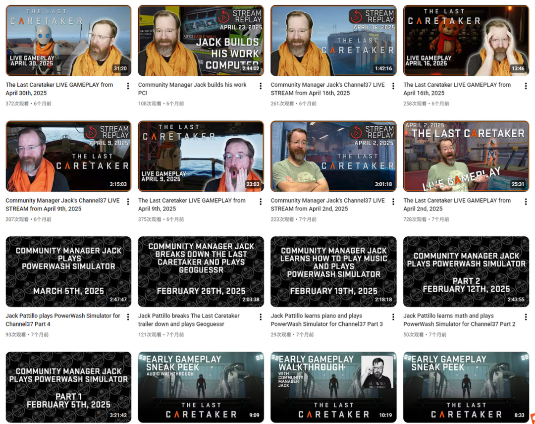游戏的早期宣传主要依托于YouTube平台,由公司的社区经理Jack Pattillo负责。翻看频道历史可见,在《The Last Caretaker》拥有可玩版本之前,Jack的内容多以《幸福工厂》、《深海迷航》等同类型生存建造游戏的实况为主,这为他后续推广自家游戏积累了深厚的社区理解和观众基础。