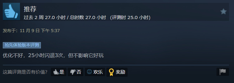 许多玩家在评测中不约而同地提到,游戏虽然目前存在一些技术问题,例如有玩家反映在25小时的游戏过程中遭遇了3次闪退,但普遍认为其核心玩法富有魅力,给出了“优化不好,但不影响它好玩”的真实评价。