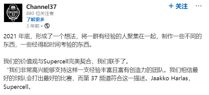 2022年6月,芬兰手游巨头Supercell宣布对其进行投资,双方将合作开发一款PC平台游戏。此举被视为Supercell拓展PC和主机平台市场的重要一步,而选择与Channel37合作,也反映出市场对这支团队研发能力的认可。