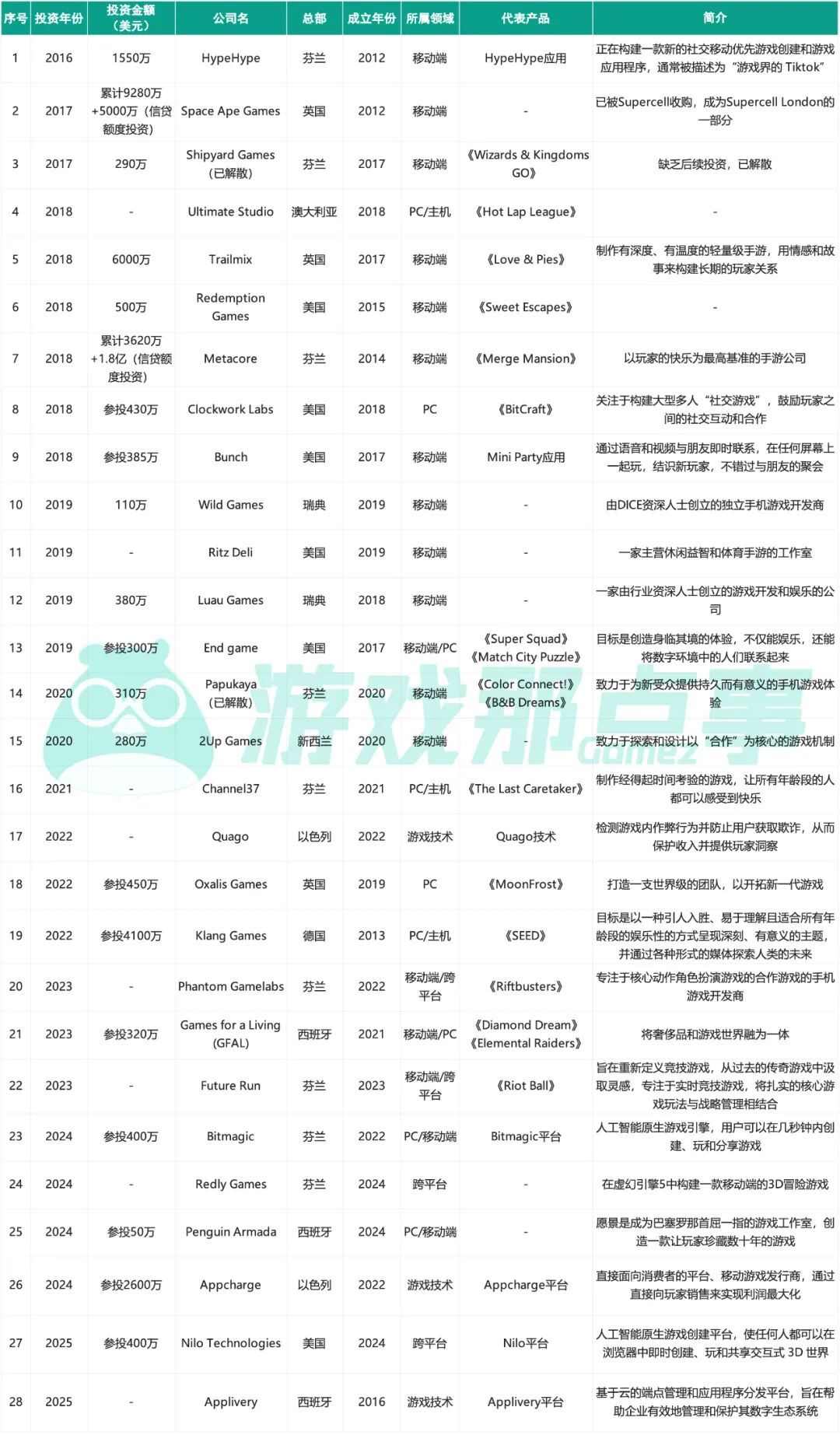 (据不完全统计,2016年至今Supercell投资了超28家游戏相关公司)