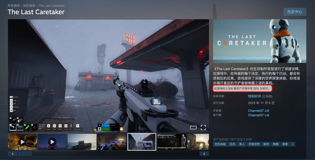 在评价方面,游戏也收获了积极的初步反响。截至发稿,基于Steam商店页显示的2509条用户评测,《The Last Caretaker》获得了82%的好评率。