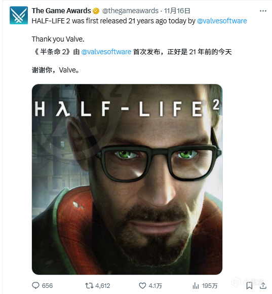 就在前幾天,TGA官號也發了一則半條命2的週年紀念推文