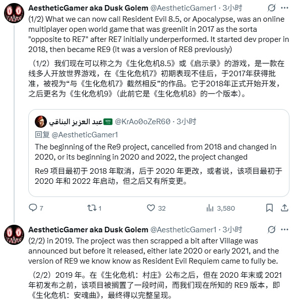 除DLC情報外,該消息源揭示了遊戲曲折的開發歷程。針對早期概念詢問,Dusk Golem詳解稱:曾暫命名爲《生化危機8.5》或"天啓"的項目於2017年立項,最初設計爲合作網遊,意在背離口碑優異但商業慢熱的《生化7》;2019年轉型爲《生化9》早期版本,最終在2020年末或2021年初被徹底廢棄,當前《安魂曲》完全承接了《生化9》標題。