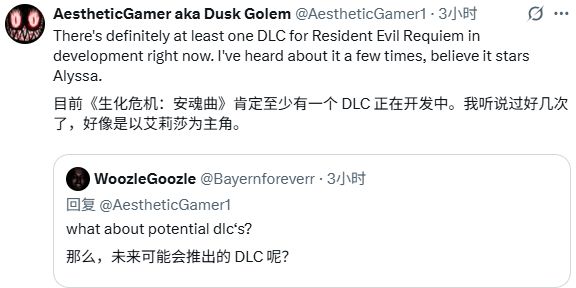 備受期待的《生化危機9:安魂曲》持續引發熱議,知名社區消息源AestheticGamer(即Dusk Golem)披露新情報。該知情人士通過系列社媒動態透露,卡普空正爲這部生存恐怖新作開發至少一款DLC,預計以艾麗莎爲核心角色,印證了通過發售後內容擴展敘事的推測。Dusk Golem最初表示:"《安魂曲》確定至少有一款DLC在開發中,多次聽聞艾麗莎將擔任主角。"