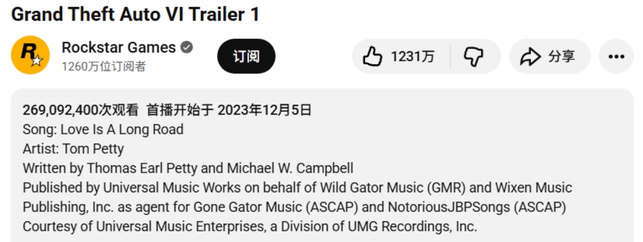 Rockstar Games《GTA6》首支预告片创下历史性成就——在未使用广告推广的情况下,该预告片在YouTube平台以2.69亿次观看量登顶无广告类预告片历史榜首。