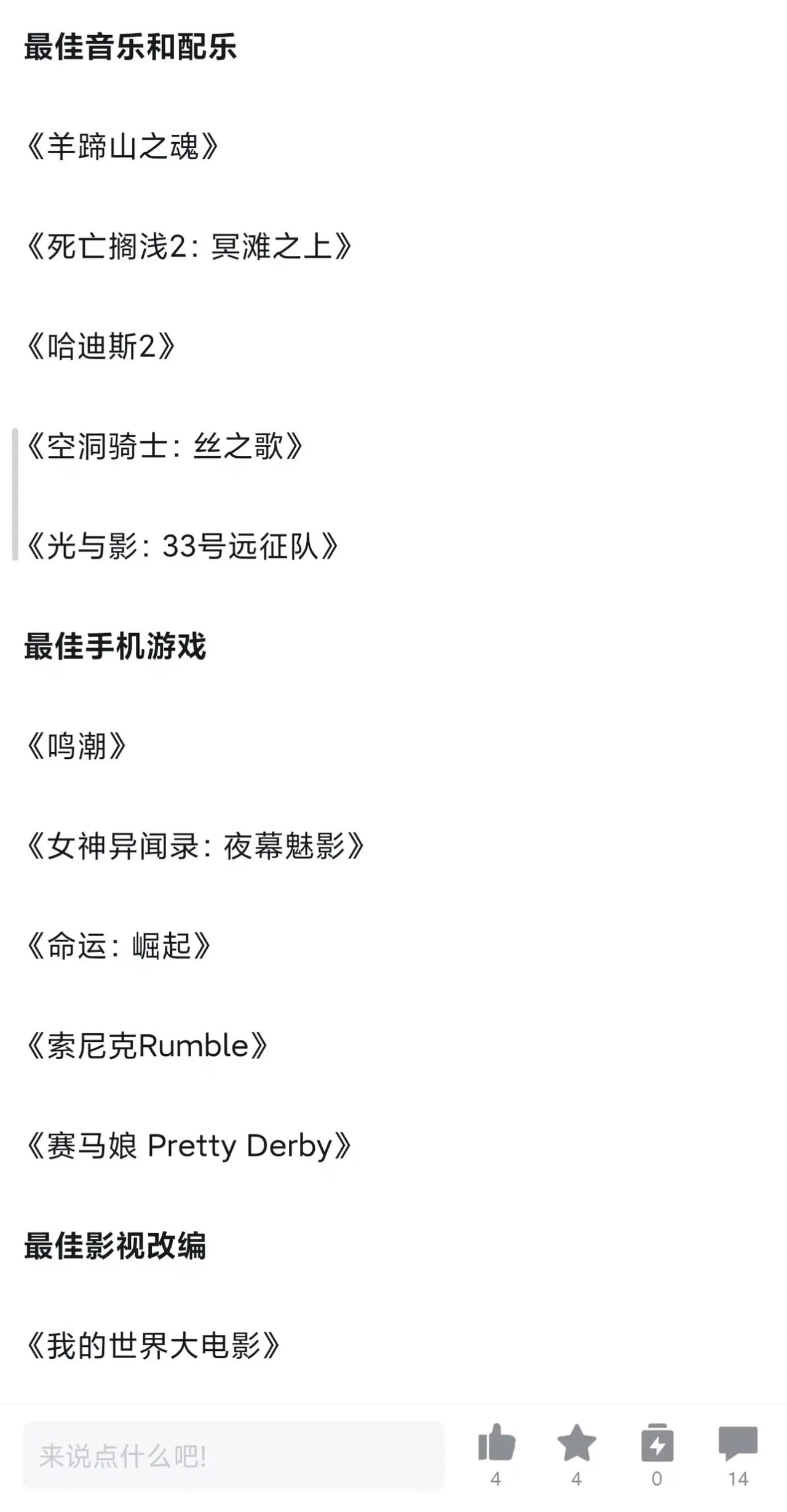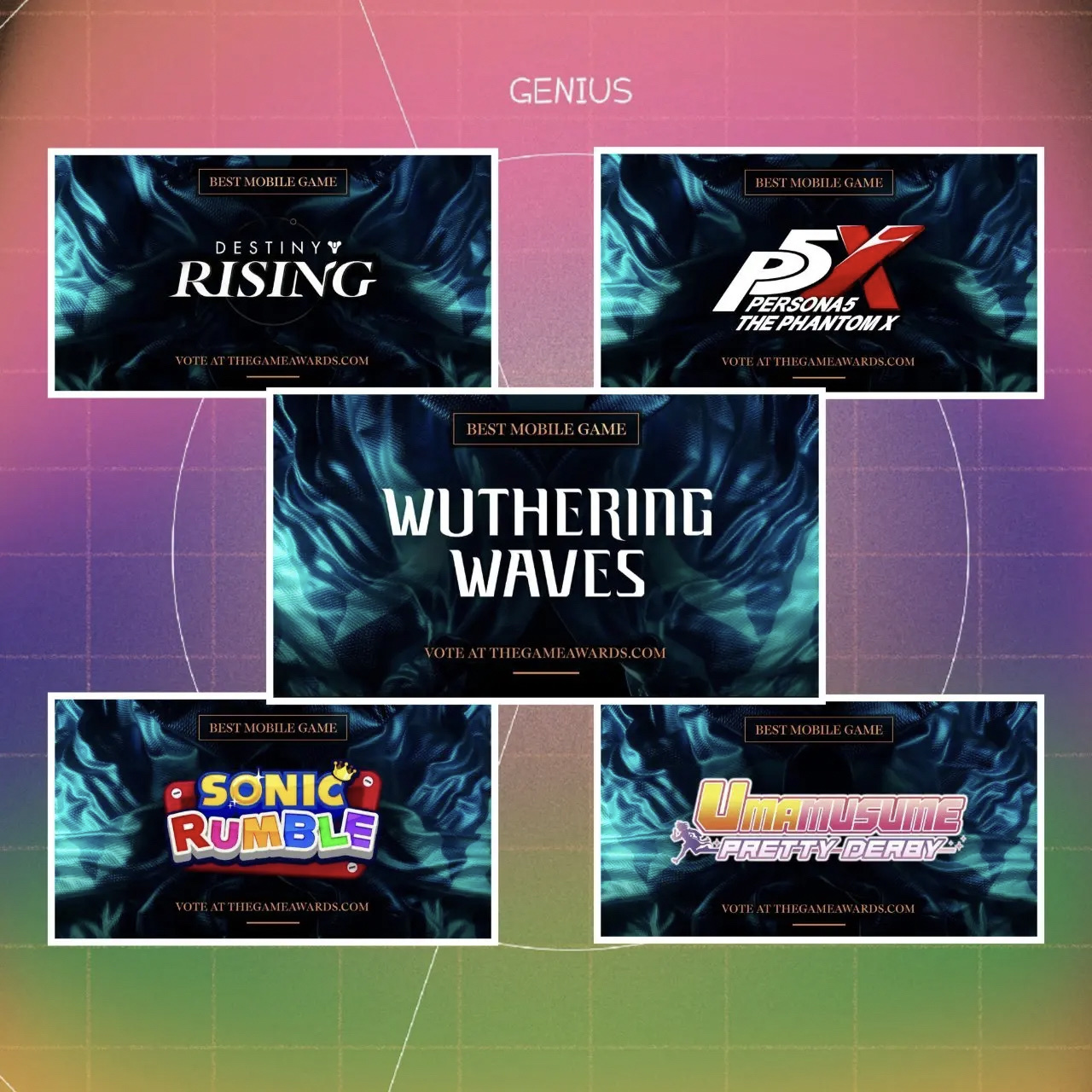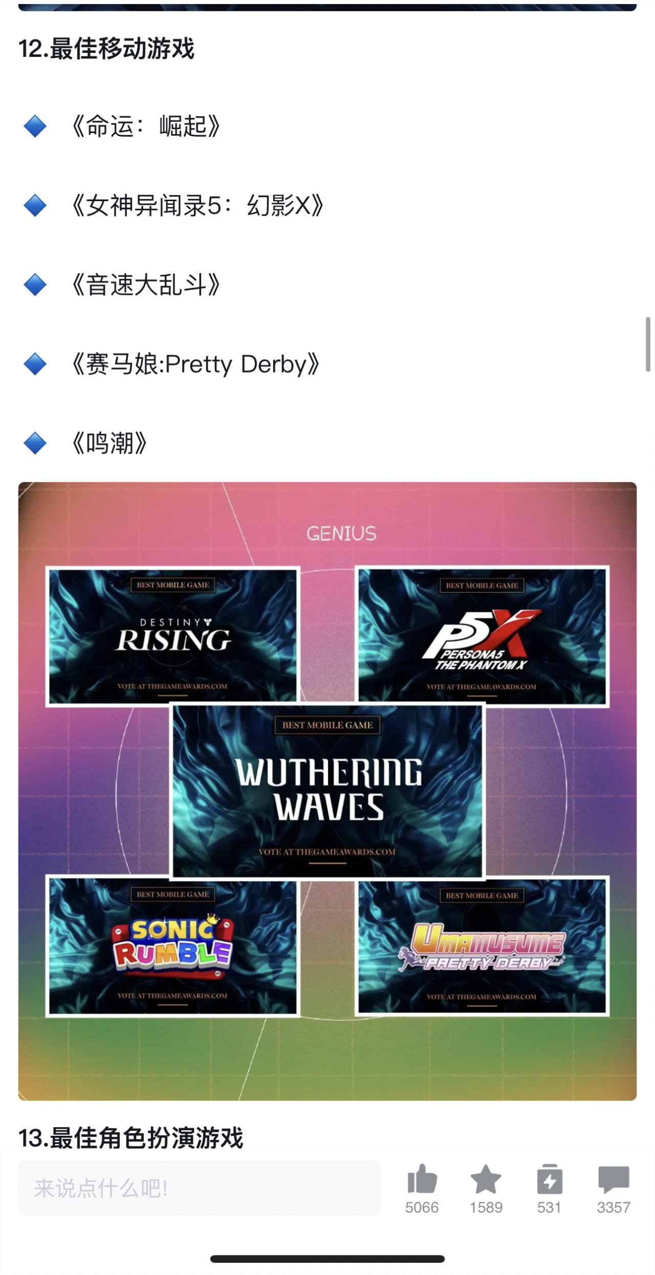 今年肯定是鸣潮了吧 2025-11-18 手机游戏 怎么记得去年提名过了同一个游戏能提名两次大概率就是冲着发奖去的?:tga最佳游戏最佳手游好快啊,这就一年了 更多游戏资讯请关注:电玩帮游戏资讯专区 电玩帮图文攻略 www.vgover.com