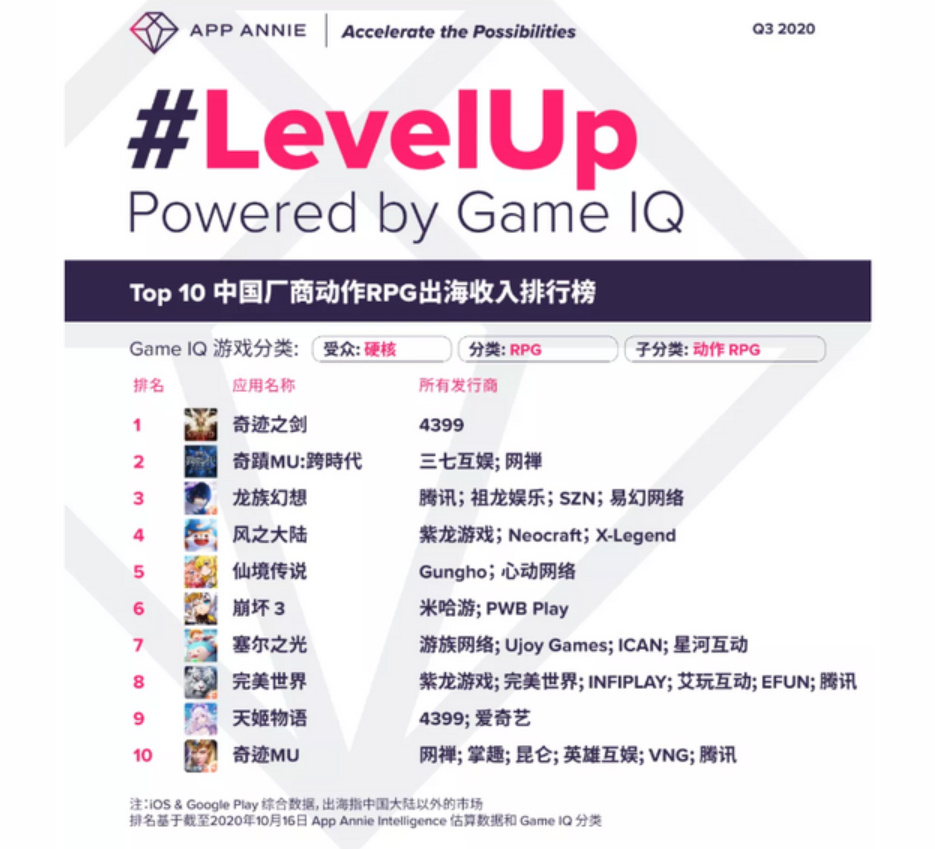 10月22日,App Anine发布了2020年第三季度中国内地动作角色扮演类游戏,出海收入前十强的榜单。