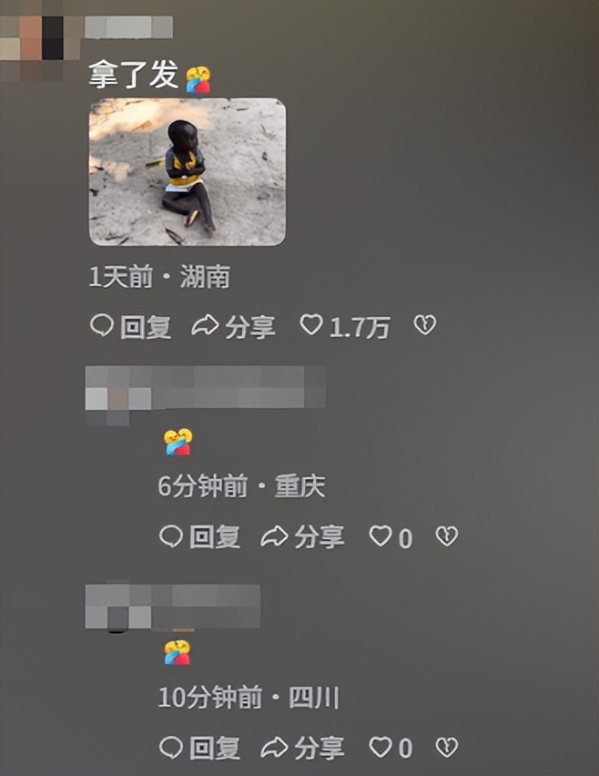 當然,神祕的地下交易,也會適時出現。他們猶如接頭特工,在評論區中打出特殊的暗號,表示自己已經收到表情包——準確來說,其實就是一羣人在到處分發值得一存的表情包。他們手裏的存貨就這樣傳來傳去,留下了一個又一個關於這位非洲孩童的傳說。