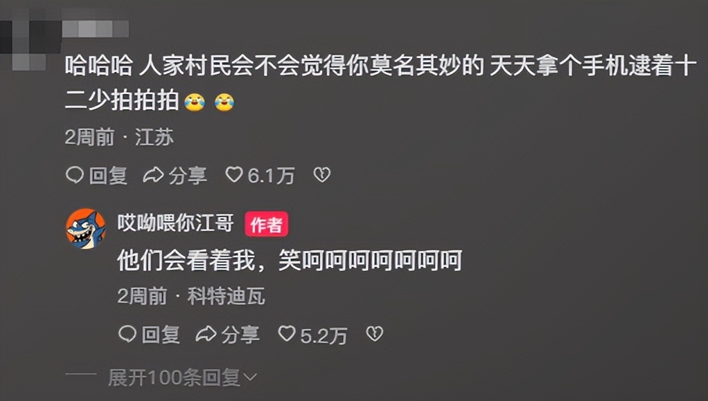 自那之後,江哥與十二少的日常互動便一發不可收拾。不管是出於網友們的指令,還是作爲村裏少數幾個中國人(實際上,村裏還有一個拍攝十二少的中國博主“超哥”)對外國友人的好奇,他的行動都多少帶點抽象——比如突然抓起十二少的手、突然抓起十二少的腳、突然檢查十二少穿沒穿內褲……可即便這樣,十二少也不哈氣,屬於情緒穩定耐逗王了。
