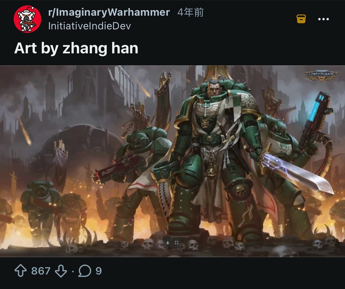 由于风格成熟、设定把握精准,他的画很快被战锤社区注意到。粉丝站 40K.gallery 专门为他开设作者页,收录了二十余幅作品。