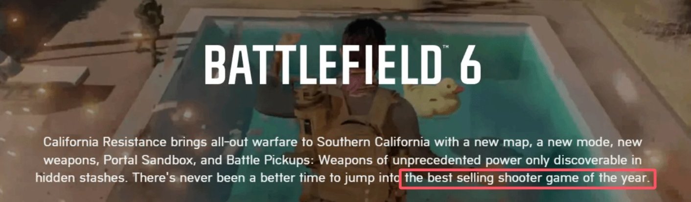 EA近日正式宣佈,《戰地6》已成爲“年度最暢銷的射擊遊戲”。這一聲明被視爲對《使命召喚22:黑色行動7》等競爭對手的直接回應。