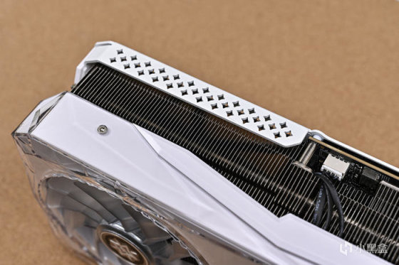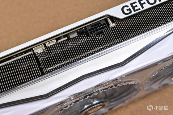 顯卡供電接口位於 Logo 燈上方,爲全新12VHPWR 供電接口,支持 PCI-E5.0規範,單口可達 600W。旁邊還有顯卡 ARGB 同步接口。