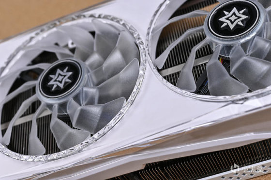 顯卡側面中央是 Logo 燈,採用多層折射鏡面設計,支持 ARGB 燈效,Logo 燈+ARGB 三風扇+定製支架構成了全新星曜 ARGB 燈效系統。