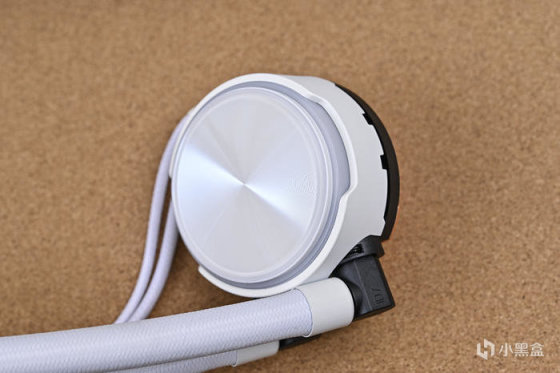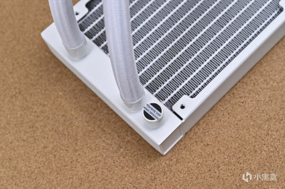 取出一體水冷本體。全白化設計,重量還是蠻重的,白色尼龍編織水管,接頭包覆處材質爲橡膠。這款冷排採用雙腔體水頭設計,更高流量、更低噪音、強化散熱性能,搭配了大尺寸純銅底板。