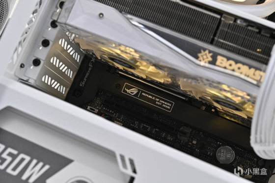 主板下方通體覆蓋大面積厚實的散熱裝甲,PCH 散熱器的外觀銀黑條紋組成的ROG信仰之眼,無 ARGB 燈效,個人更喜歡這樣有金屬質感的無光設計。兩個PCIe5.0 x 16 擴展插槽的表面均有金屬保護罩,提高接口強度的同時還可以避免信號干擾,下方還有一個 PCIe 4.0x16 插槽。第一條 PCIE X 16 支持最高 PCI-E 5.0 X16,第二條 PCIE X 16 支持最高 PCI-E 5.0 X 8 (以上 2 根共享 CPU PCI-E 5.0 X16,提供 X16/X0 或 X8/X8 的組合),最下方PCIE x16 實際爲 PCI-E 4.0 X8 的通道,方便支持 ROG HYPER M.2 CARD 上的雙 PCI-E 4.0 X4 M.2 SSD。