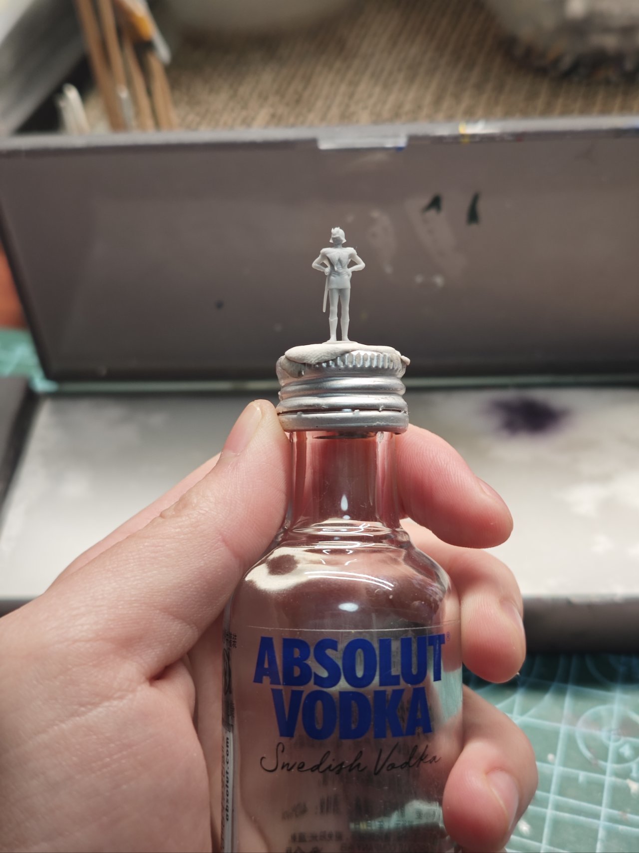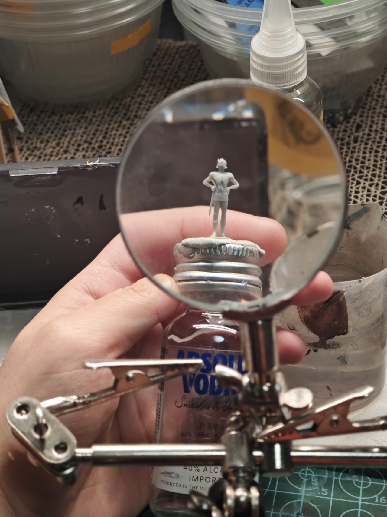 ▪模型可以用夹子、专门涂装的台钳、握持器,或者也可以用饮料瓶盖、笔涂漆瓶之类趁手物品,用蓝丁胶粘住即可