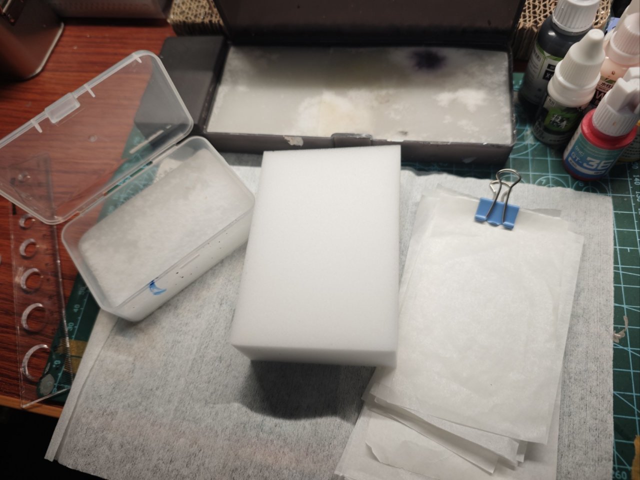 当然完全可以自制,找个盒子里放一块洗碗高密度海绵+无纺布+盖水贴的纸就完成了,水贴纸消耗完了可以用烘焙的油纸替代✧(ˊωˋ*)✧不过长时间涂微缩的话还是买个扩散型调色纸