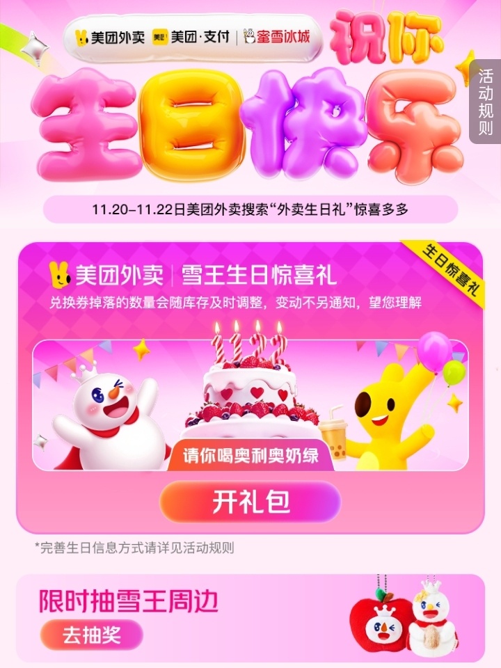 美團搜索🔎“外賣生日禮”【開禮包+抽周邊】