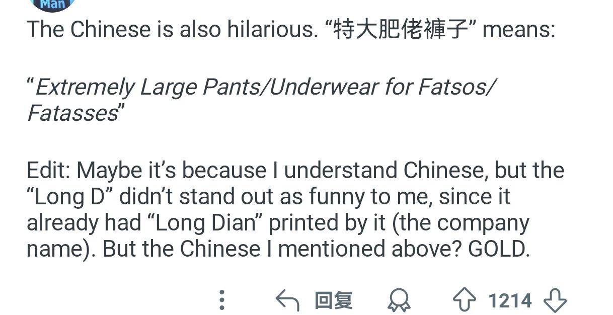 「中文部分才叫绝!『特大肥佬裤子』翻译过来就是:『专为肥宅设计的超大号内裤/底裤』」 补充说明:「可能因为我懂中文,并不觉得『Long D』好笑(毕竟旁边印着品牌名『龙点』)。但我上面提的中文翻译?简直是神来之笔!」
