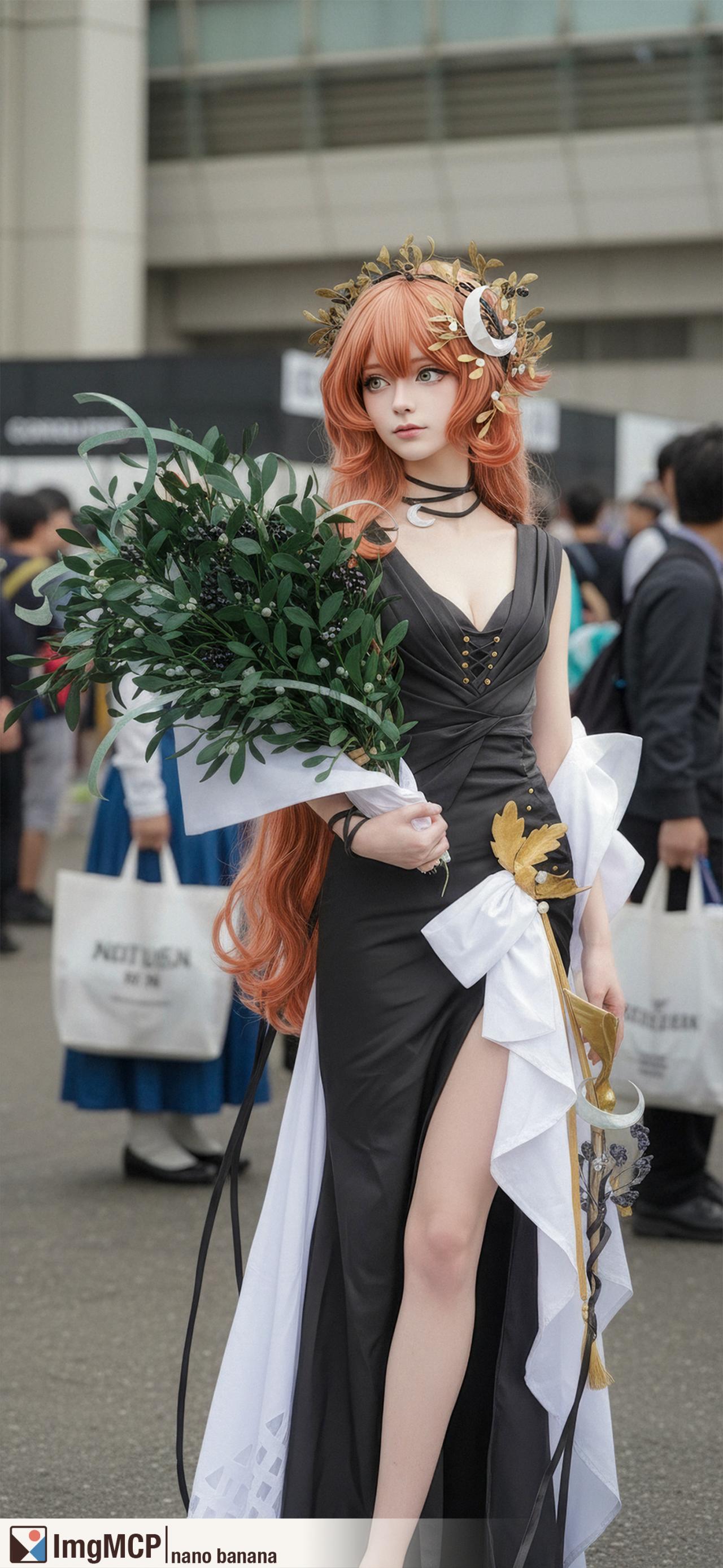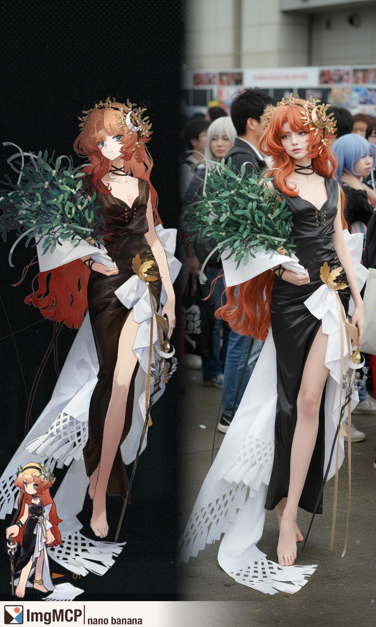 非漫展图片的制作流程是,先使用立绘和固定提示词生成角色在漫展的“真人”照片,再使用这张照片作为参考图,生成非漫展照片,例子: