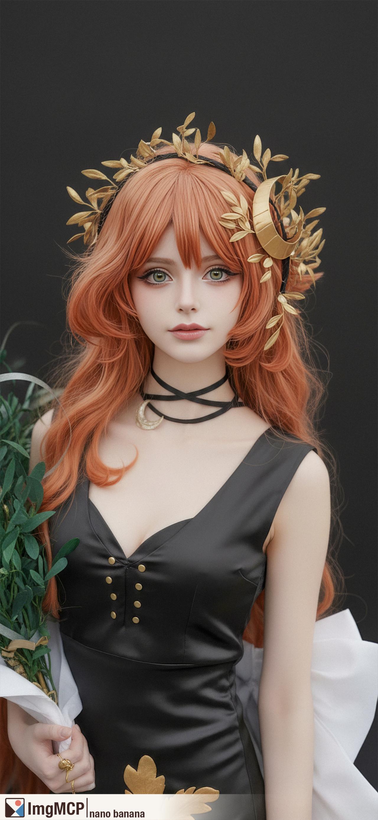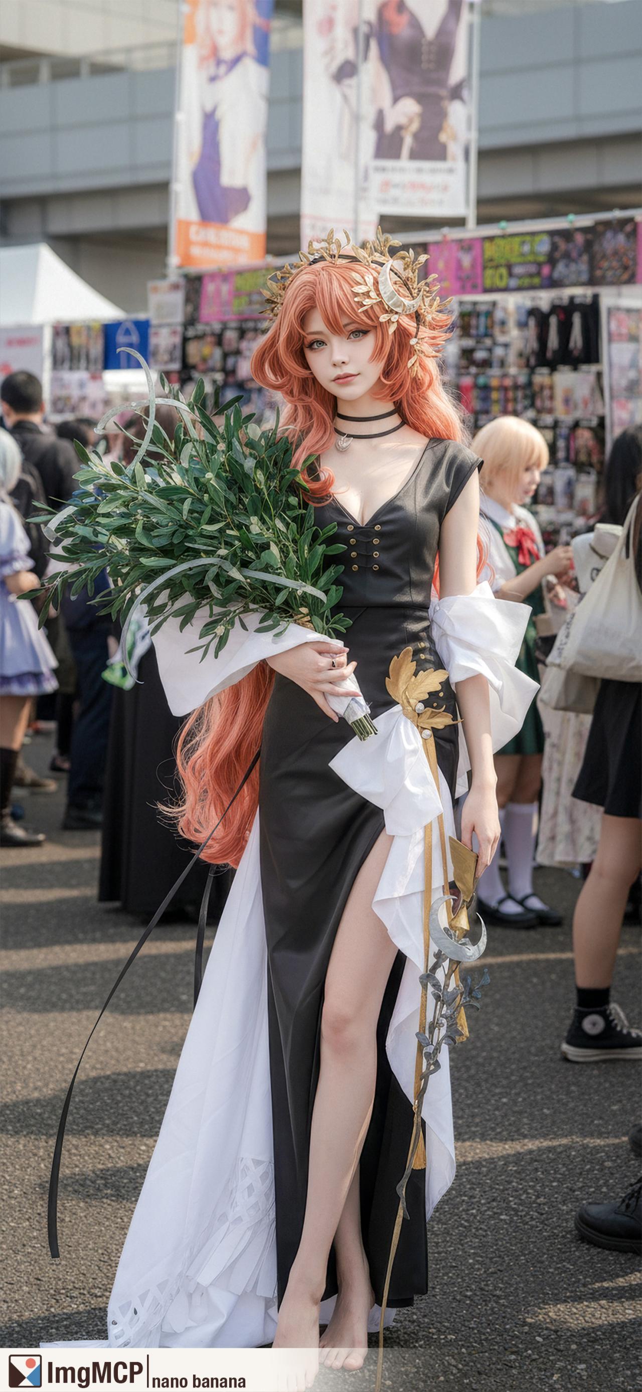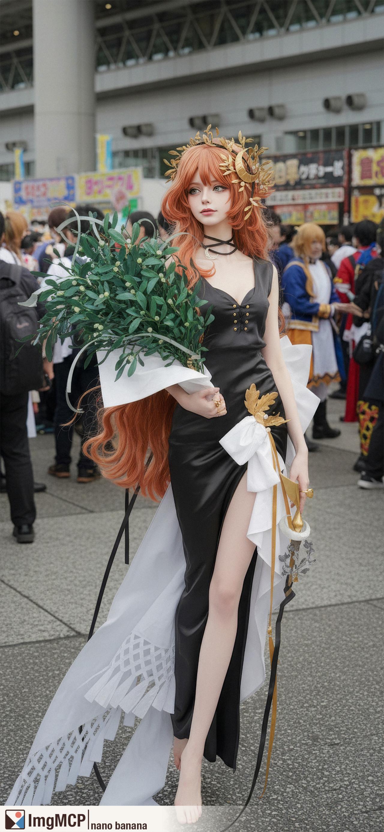 Prompt: Generate a highly detailed, realistic photo of a person cosplaying the character in this illustration, at Comiket. Exactly replicate the same clothing, accessories, props from the original illustration. Reproduce the expressions and emotions of the original illustrated, feature realistic and textured materials, including expensive haute couture. standing posture and perform the illustration's signature pose.