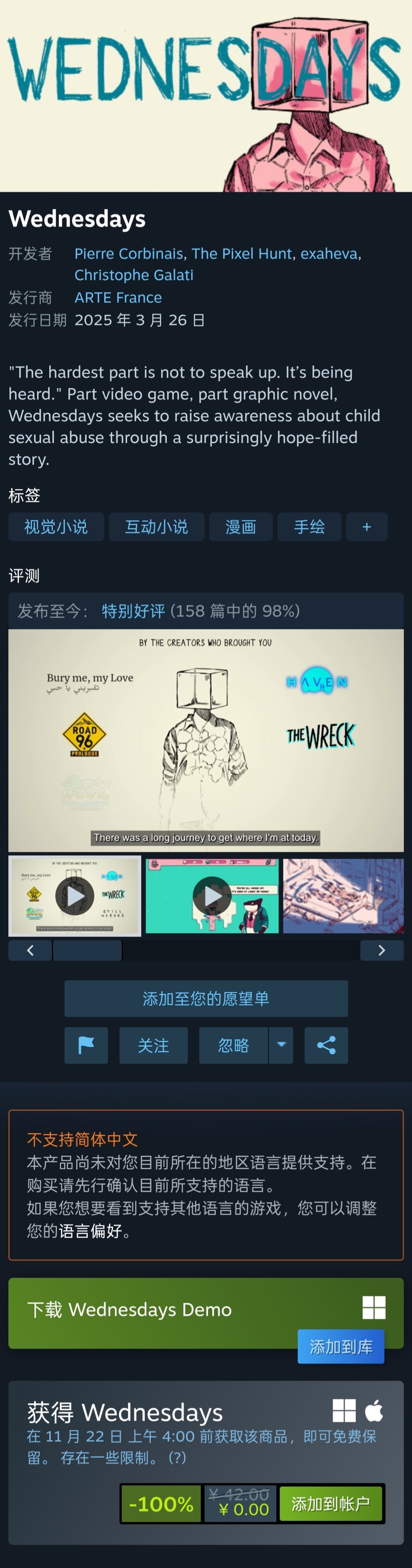 大家好呀大家好,又有免費的賽博雞蛋領了。11月22日4:00前Steam平臺限時免費領取原價42元的《Wednesdays》。可以不玩,不能沒有。記得領哦。