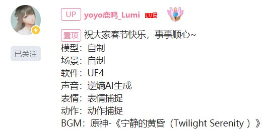 简介显示模型和场景为自制,使用UE4制作、动作捕捉技术,还提到这是其即将开展的小型项目中动作捕捉流程的初步测试。凭借精美模型、高水平头发与布料渲染快速圈粉。