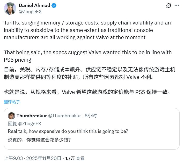 Niko Partners研究洞察總監丹尼爾·艾哈邁德在X平臺就Steam主機定價補充說明。他首先分享了一張寫有"聽聞價格時請勿驚呼"的圖片,並指出關稅、內存存儲成本飆升、供應鏈波動以及無法像傳統主機商實施補貼等因素正制約Valve。但艾哈邁德認爲硬件配置顯示Valve最初意圖讓Steam主機與PS5定價看齊。