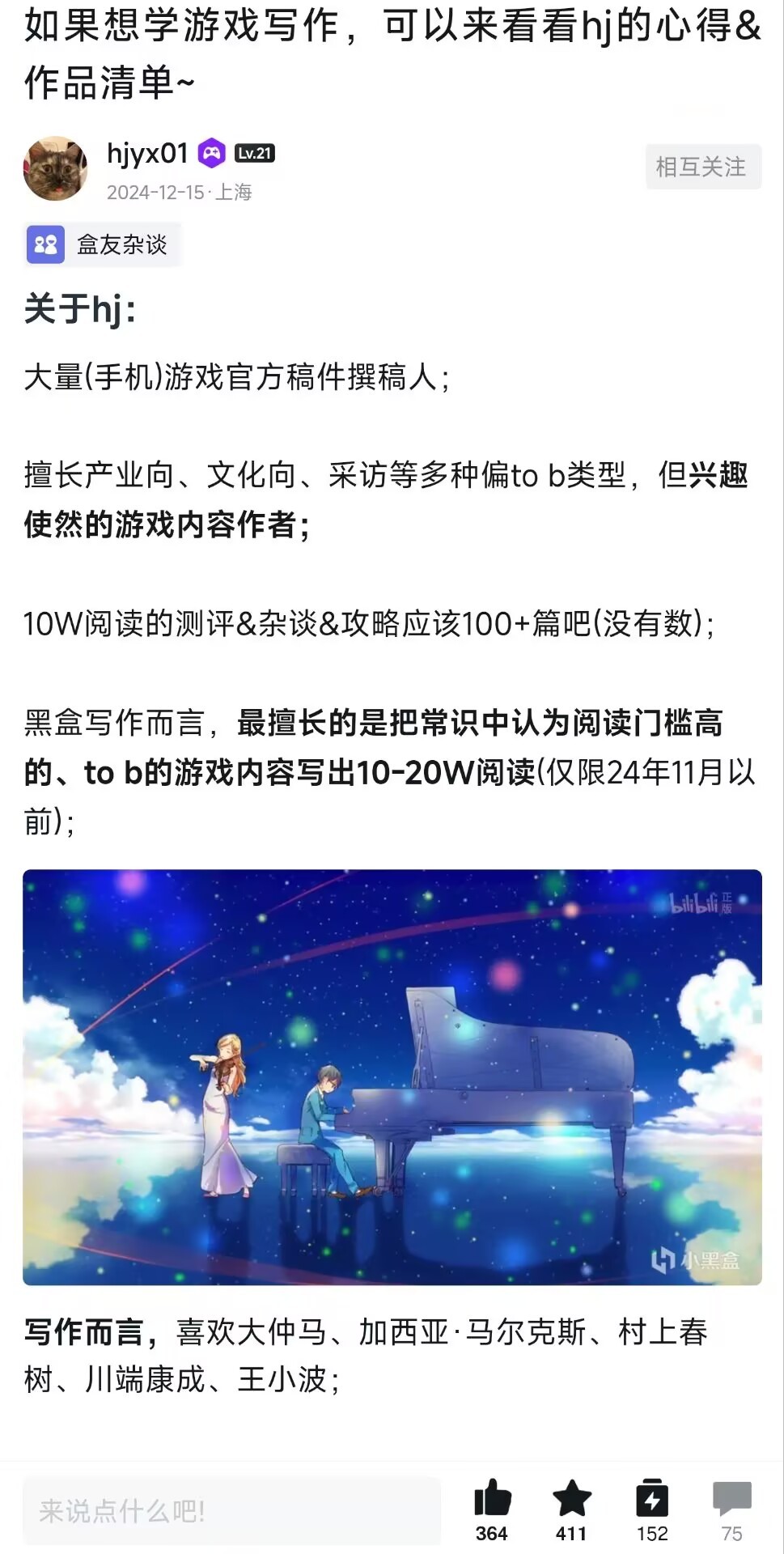 hj(断剑)老师真的超级厉害,真的只要你看过他的文章就会爱上。无论是专业性和观感都是黑盒最强的一档,我基本上每篇都会看。很多游戏也都是断剑老师推荐过我才会去玩的。无论是游戏中一个角度还是多个角度的选取,还是选题方向,排版布局,亦或是每一个字的斟酌,加粗强调,情感,节奏都在追求这篇文章的极致。无论是常规的专业测评,还是充满感情的杂谈测评,又或是写作技巧都能透露出恐怖阅读量和写作量以及强烈的人文关怀。并且老师最让我敬佩的一点就是他写的这样厉害,还在不断进步,并且超级谦虚,什么都愿意分享,会毫无保留地为你指出每一个困扰作者的命题并写出自己的经验:文章是为自己写还是为读者写。(当初看到这句话真的幡然醒悟。)专业并且不断进步,这是我对于断剑老师最大的印象。在现实中我曾远远地看向断剑老师,成熟的形象,一看就很有故事,我却不敢上前打招呼,这是我这次的一大遗憾。(太社恐了!)
