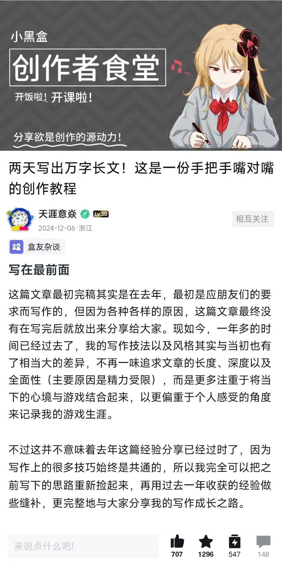 天涯老师可以算是对我黑盒写作和人生路帮助超大的一位老师。我看过天涯老师的万字长文和写作技巧指导的文章,可以说是天涯老师指导了我写作之路的开始。当我学习了之后,才真正开始写我的第一篇测评《彼方的她》,从列结构再到后面情感表达都花了很长时间,写完虽然数据很差,但我真的很满意,也很开心。我之后写了好几篇例如《浪人崛起》《波斯王子》《黑暗世界》这样5-6000字的文章之后,我对写测评文章已经有了一些基本法。可当我看了天涯老师的数篇w字高质量文章之后,我明白自己还差得远。我也始终牢记,写文章最重要的,是给文章加一点爱!