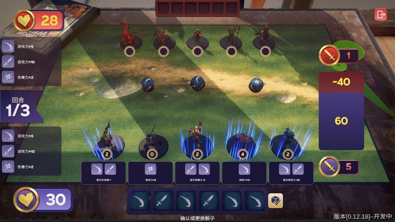 於是如何在攻擊力與傷害力之間取得平衡,成爲對局中的關鍵決策:是穩紮穩打確保輸出,還是冒險一搏追求最大殺傷?此外,骰子的排列組合還能激活模型的特殊效果,例如削減敵方生命值、提升己方攻擊力等,讓每一回合的抉擇都充滿刺激。