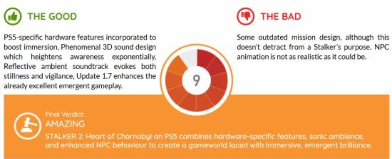 外媒Gamingbolt爲PS5版打出9分好評,認爲其結合專屬硬件特性、環境聲效與增強的NPC行爲,成功打造出一個充滿沉浸感與湧現式精彩的遊戲世界。PS5版《潛行者2》充分利用了DualSense控制器的觸覺反饋和自適應扳機功能。玩家在潛行和戰鬥時能感受到更爲細膩的操作反饋,彷彿真正置身於遊戲世界。遊戲採用先進的3D音頻技術,大幅提升環境感知的精準度與層次感。富有反射感的氛圍原聲,同時喚起寧靜與警覺,增強了切爾諾貝利禁區的恐怖氛圍。針對PS5 Pro的專屬性能增強支持也已經就緒,進一步優化了玩家體驗。評測指出,PS5版的幀率表現更加穩定,紋理彈出問題減少,整體運行更爲流暢。