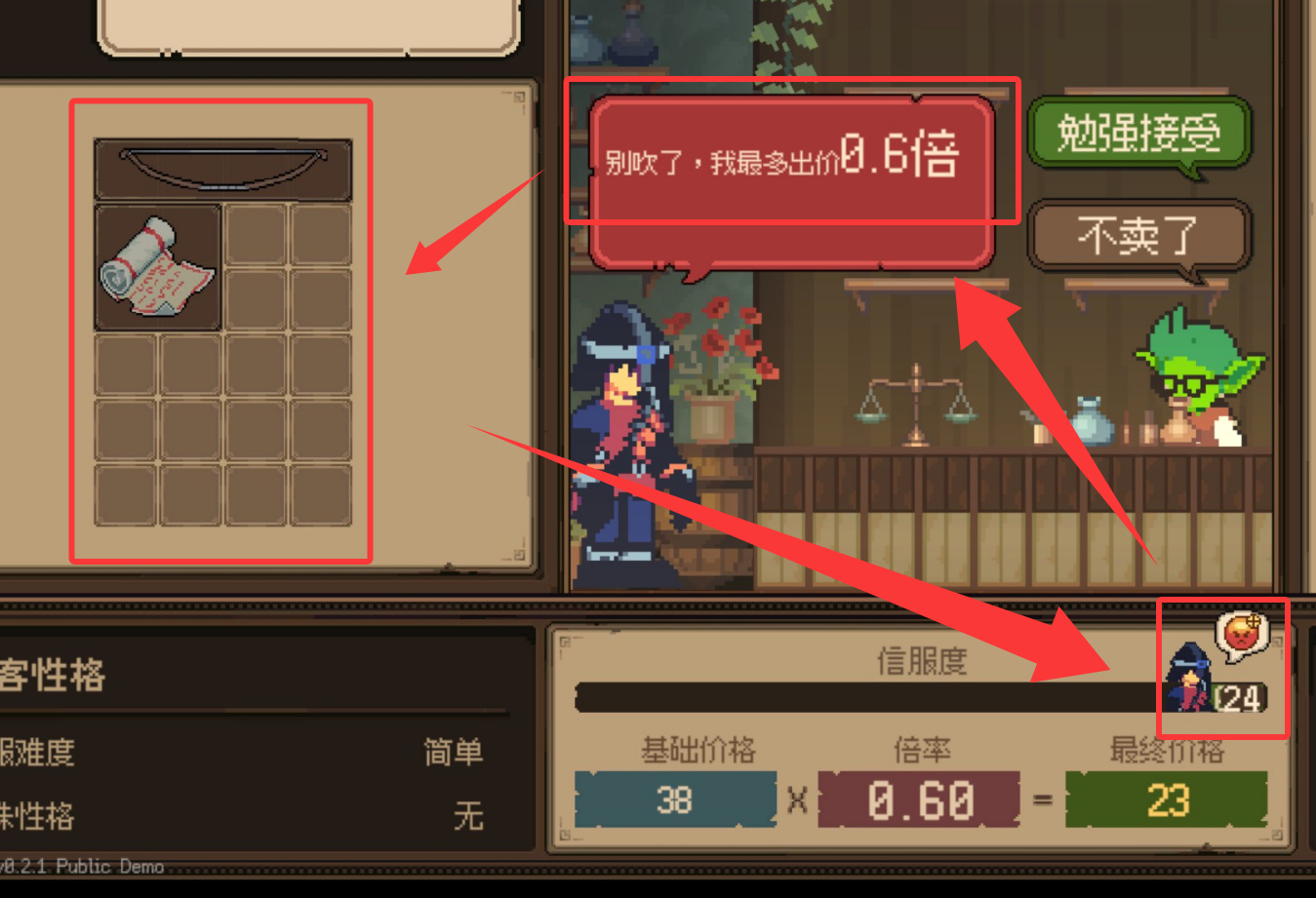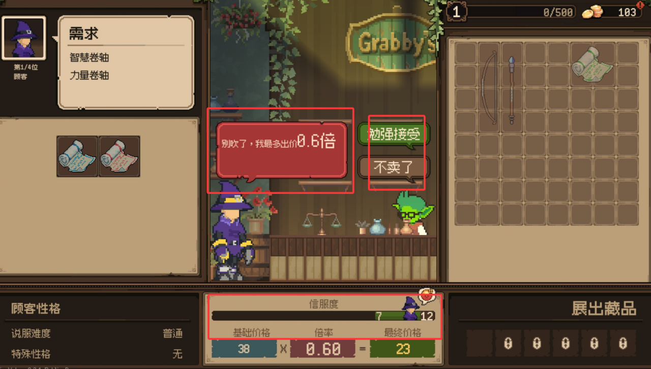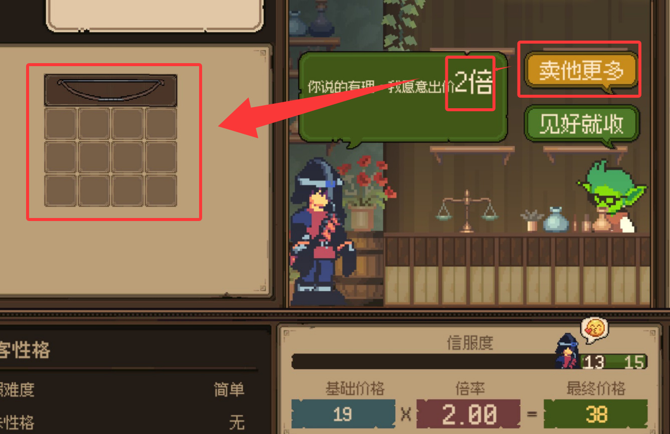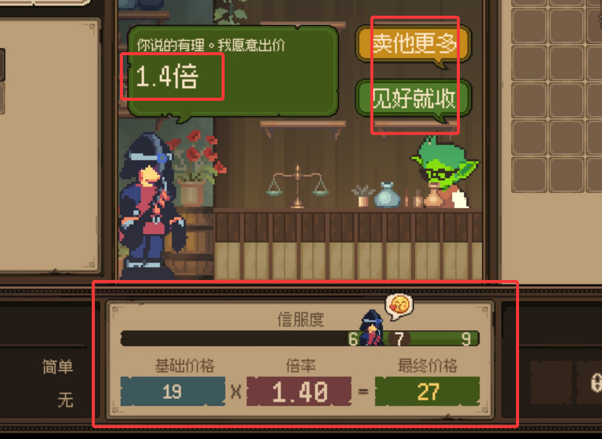 而另一个核心内容就是讨价还价,或者叫吹nb。我们可以通过一些选项来进行点数的增加,对面能够接受的范围会在下方标记出来但不同的地方在于吹nb也不能够过大的吹,吹过头了大概率也只能够落下一个0.6倍收益的下场。