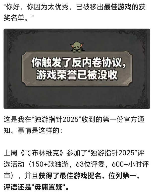 说出来你可能不敢相信,尝试体验一款游戏的理由纵使有着千千万,但我还是第一次看到这种因为本身的质量过于优秀,从而触发了“反内卷”而被“踢出”获奖行列的游戏《哥布林维克》。