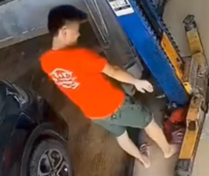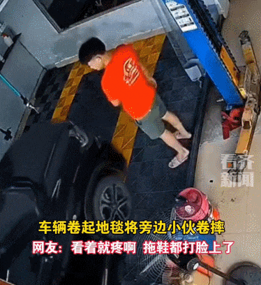 近日,廣東,一洗車行內發生危險一幕,車輪捲起地墊把洗車小哥絆摔。