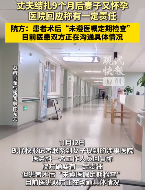 11月11日,河北一女子在社交平臺上發文稱:“老公做輸精管切斷結紮9個月了,我居然懷孕了。”她提供的丈夫當天精液檢測報告顯示,精液中含有精子。該女子懷疑醫院的手術有問題,並希望醫院承擔流產、營養、誤工等費用。