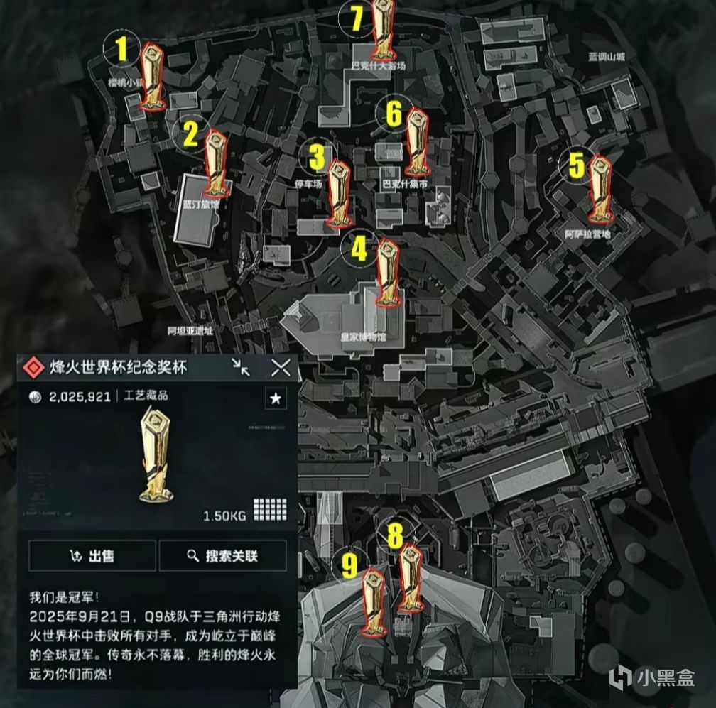 烽火纪念杯是这个赛季新出的两百多万的红色收集品,并且就占3格。由于是为了纪念2025.9.21Q9战队在烽火世界杯中夺得世界冠军而出的收藏品,因此收藏价值也较高。本期给大家带来巴克什中烽火世界纪念奖杯的具体点位!