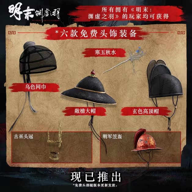 所有拥有《明末:渊虚之羽》的玩家均可获得(六款头饰装备):