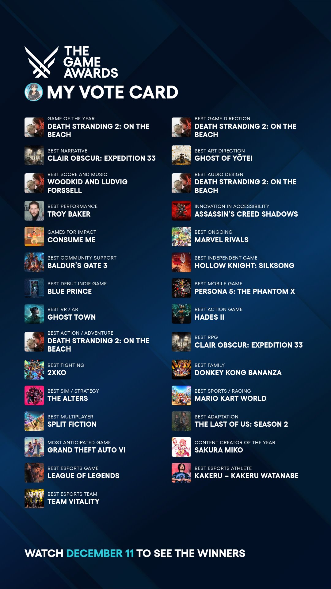 年度最佳:六个游戏都玩了,其中咚奇刚打了一半,丝之歌刚开了个头,也没啥好评价的,都是主观喜好,我是岛批,我投死亡搁浅2