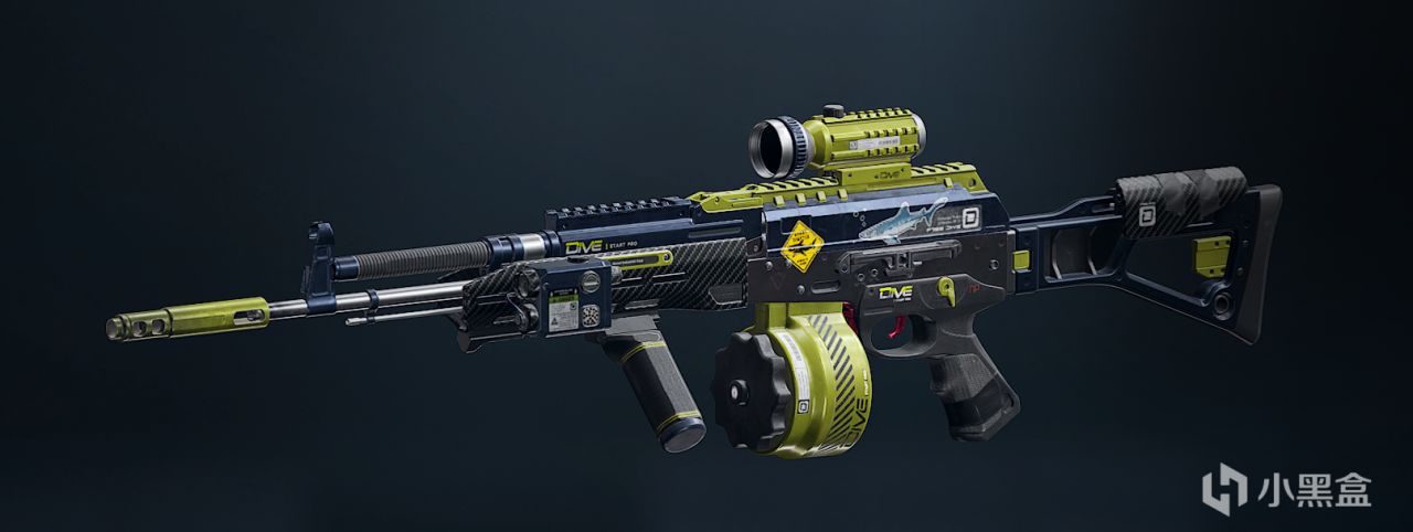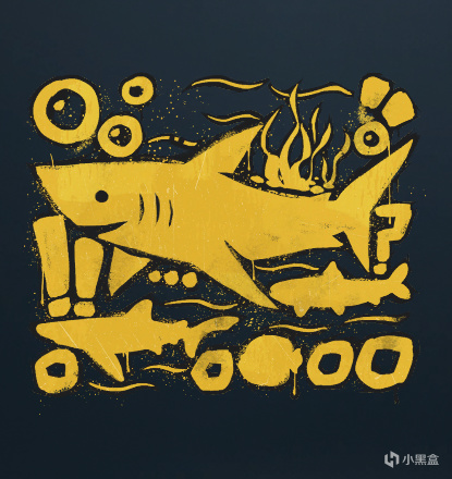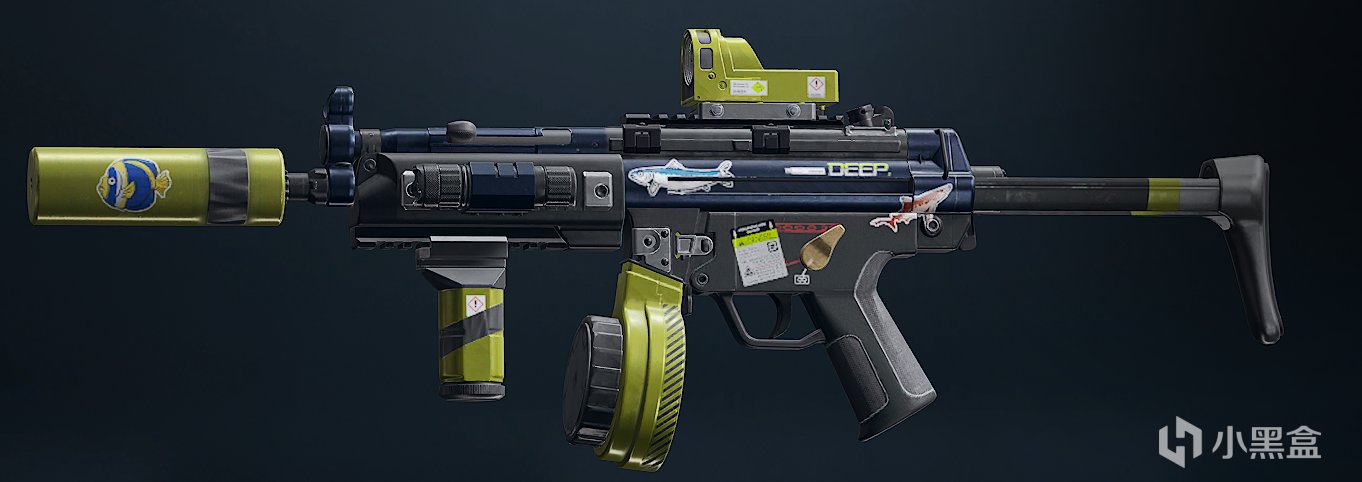 【说实话他这个寻迹深蓝的意思应该是喷漆里面很多跟海洋有关的,如枪上面的贴纸,但是全部采用黄色还是很违和比如最后这个喷漆的黄色鲨鱼感觉换成蓝色会好很多】