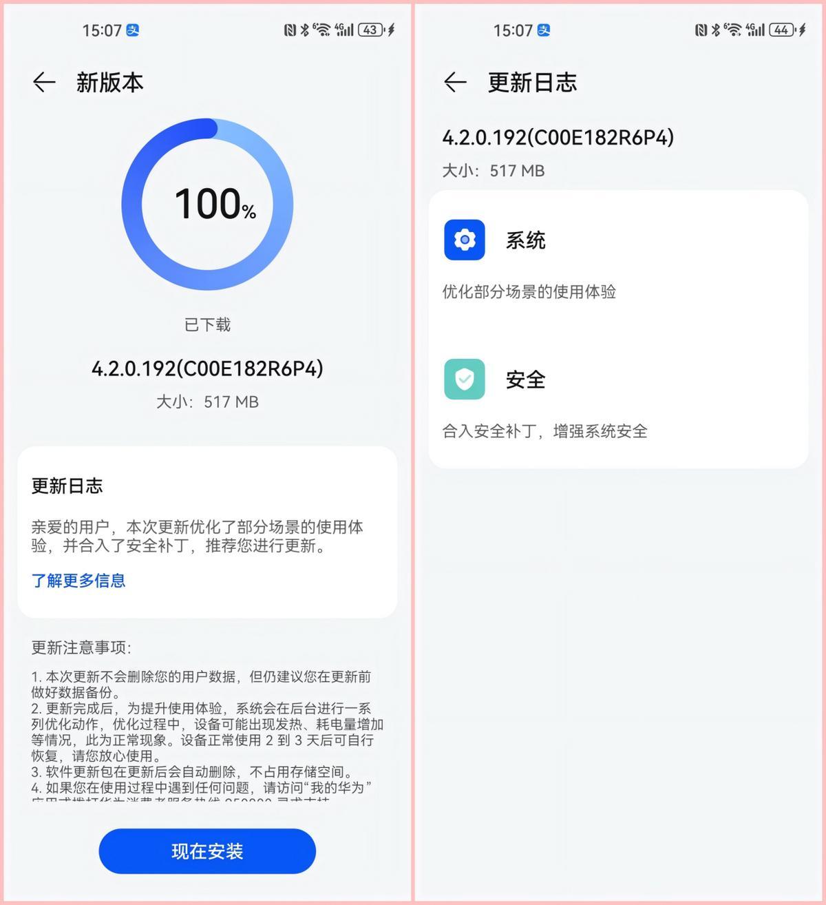 華爲沒有放棄老用戶,mate40的系統又更新啦!Mate40系列發佈已經5年了,近日華爲推送了鴻蒙4.2.0.192更新,合入了安全補丁,增強了系統安全,並優化了部分場景的使用體驗。我的華爲mate40已經不再是主力機,只是作爲備用機,印象中很久沒有更新了。此前餘承東表示華爲存量的2-3億用戶都將升級原生鴻蒙,那麼此次更新難免讓人浮想聯翩,是不是爲升級鴻蒙6或者鴻蒙5做準備呢?