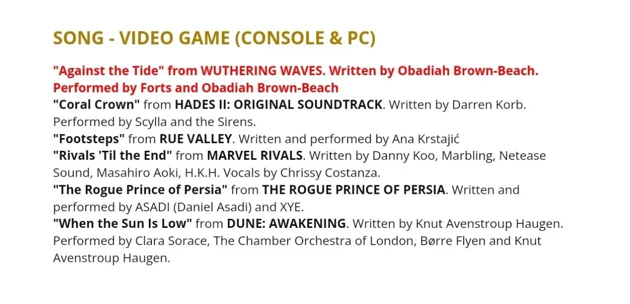 在好萊塢音樂傳媒獎(HMMA)評選中,《Against the Tide》從《哈迪斯2》《漫威爭鋒》等作品的提名曲目中脫穎而出。該獎項被視爲影視音樂類“奧斯卡風向標”,此次獲獎的《Against the Tide》由Obadiah Brown-Beach創作、Forts與作者共同演唱,以史詩感編曲契合遊戲“對抗災潮”的核心主題,此前已在玩家社區收穫高口碑。