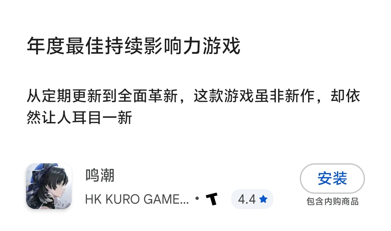 而在Google Play 2025年度榜單中,《鳴潮》獲“最佳持續運營遊戲”同時拿下美區“年度最佳持續影響力遊戲”等區域獎項,這是對其上線後持續更新、內容品質與玩家體驗的認可。目前《鳴潮》已入圍TGA 2025“最佳移動遊戲”提名,商業與口碑表現均穩居國產二次元賽道前列。