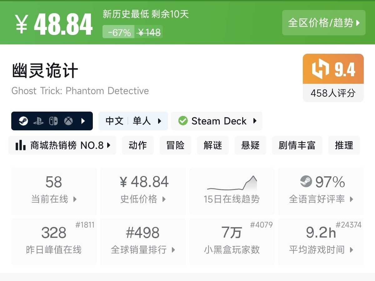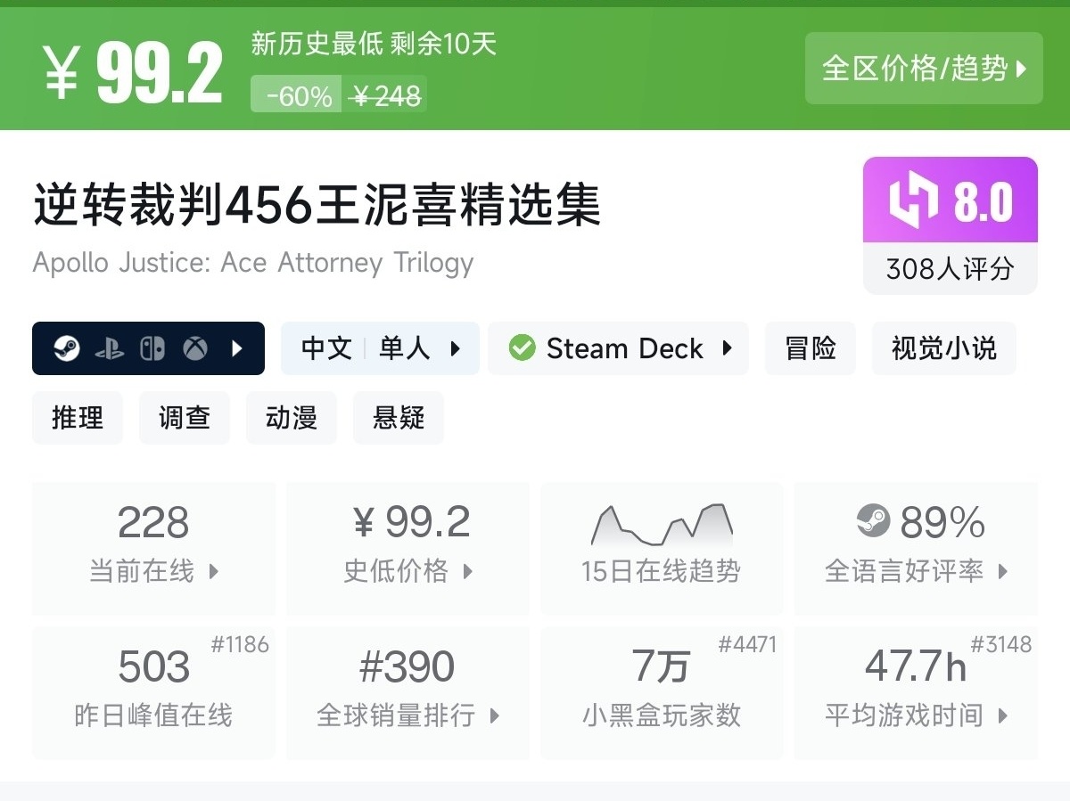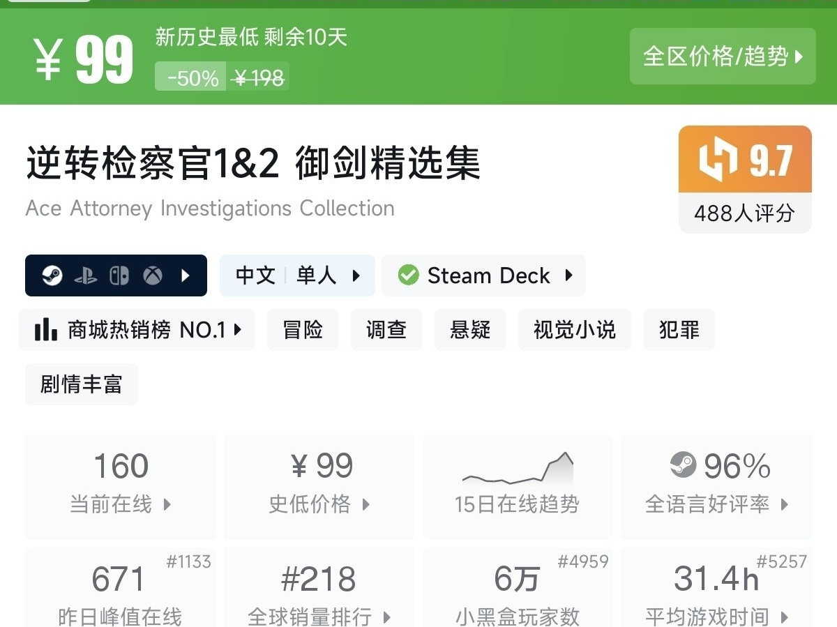 一款法庭調查冒險遊戲合集。玩家扮演檢察官御劍憐侍,在案發現場調查取證,通過邏輯推理與證人對峙,揭開案件真相。