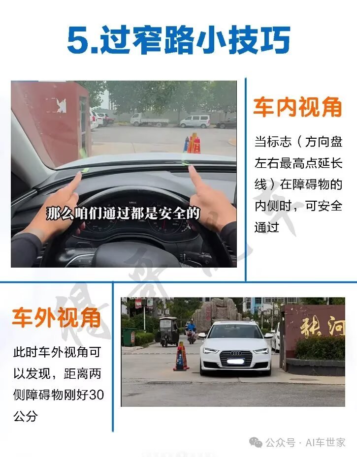 5. 過窄路:方向盤左右最高點線在障礙物內側,大膽開,兩邊留30公分蹭不着。